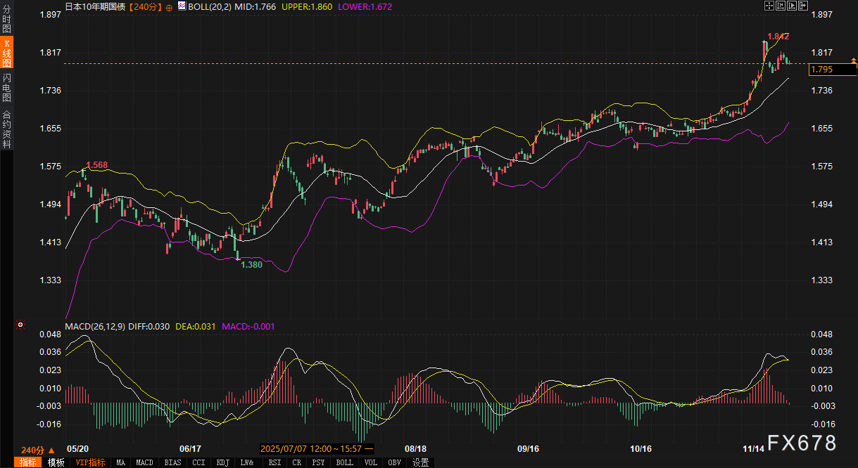 从技术指标观察,10年期日债收益率当前处于布林带中轨1.766%与上轨1.860%之间,布林带开口扩大显示市场波动性正在增加。MACD指标中,DIFF为0.014,DEA为0.018,MACD柱状图为-0.008,暗示短期动能偏弱。这些技术信号与基本面因素相互印证,反映出市场正在重新评估日本货币政策正常化路径与财政扩张之间的平衡。