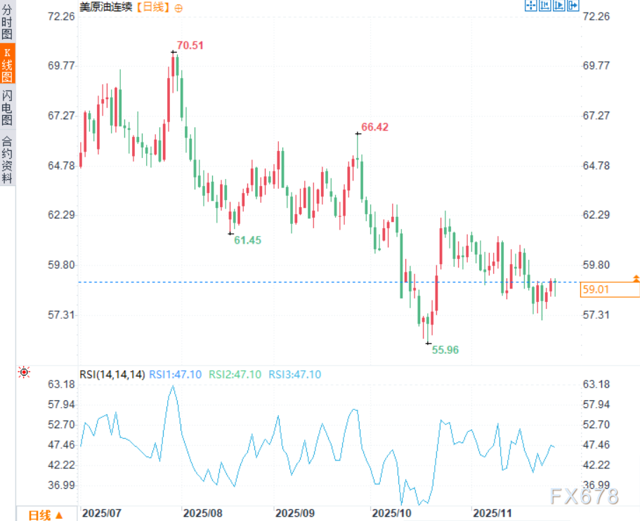 当前的市场环境正从“交易战争”转向“交易和平”。和平进程加速是明确的看空原油信号,它正逐步抽离自冲突以来便根植于油市的风险溢价,近期油价始终位于较低位,本周早些时候油价创下近一个月低点,达57.10美元/桶,周五亚市早盘时段,美原油于59.00美元/桶附近窄幅震荡,对比前一交易日收盘价58.65美元微涨约0.61%。